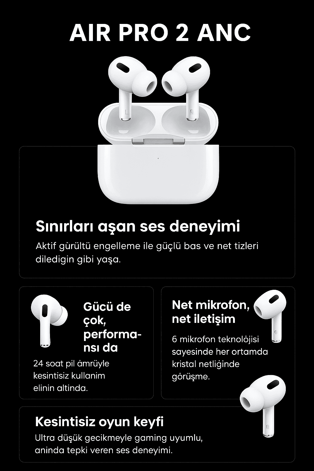 Ergonomik Tasarım(Her Kulağa Uygun): Air 2 kulak yapınıza tam oturacak şekilde tasarlanmış ileri seviye yeni nesil kablosuz kulaklık modelir.
